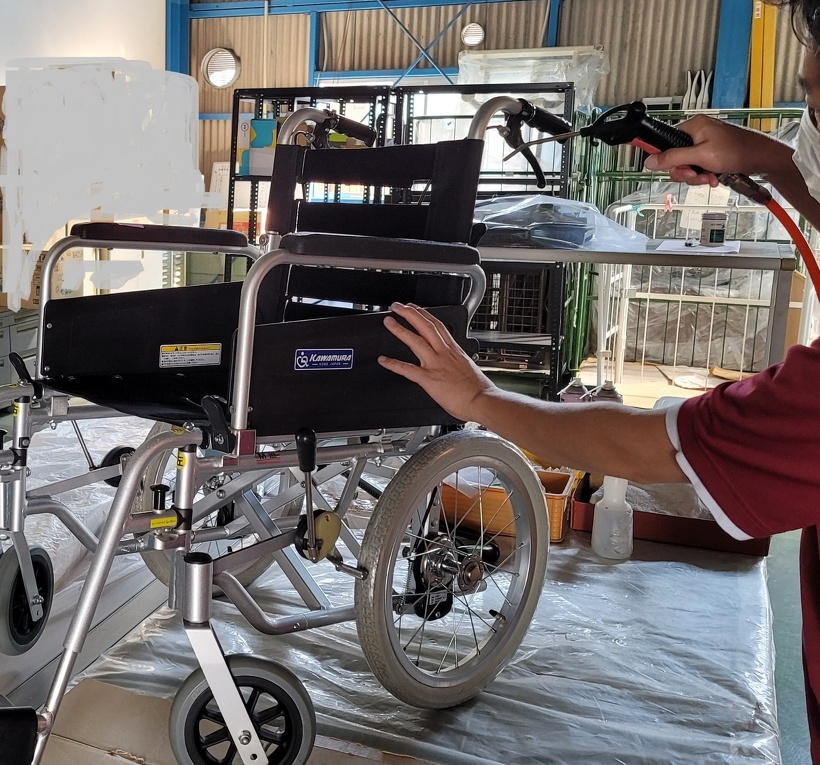 お客様の車いすの洗浄・消毒・光触媒コーティングを実施しました。